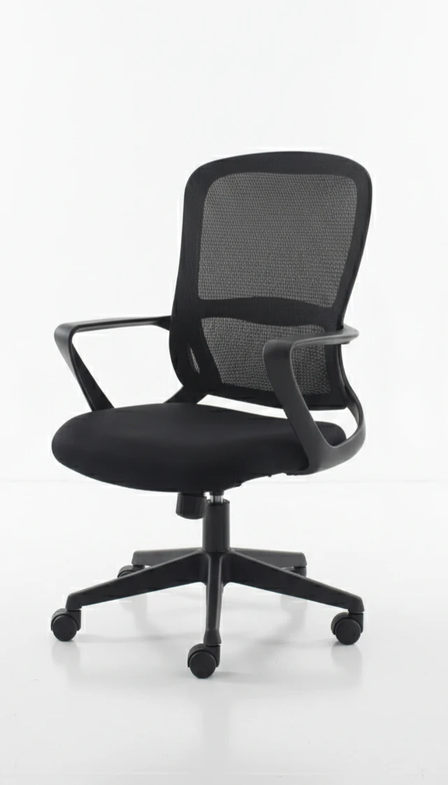 The Prime Office Chair ​Meet the Prime, a sleek and versatile office chair designed to blend modern aesthetics with reliable ergonomic support. Crafted with a minimalist, all-black silhouette, the Prime is an ideal seating solution for professional workspaces, home offices, and study areas, engineered to keep you comfortable and focused throughout the day. ​Key Features ​Breathable Mesh Backrest: The high-quality, densely woven mesh promotes optimal airflow, preventing heat buildup. It naturally contours to the curve of your spine, providing consistent and responsive lumbar support. ​Structural Support Frame: The rear of the chair features a reinforced support system that anchors the mesh. This structural design ensures the backrest maintains its shape and durability over years of use. ​High-Density Foam Seat: The generously padded seat cushion is upholstered in a durable, breathable black fabric. It is designed to distribute weight evenly, reducing pressure on the lower body during extended periods of sitting. ​Integrated Loop Armrests: The smooth, contoured armrests connect the backrest to the seat. This fixed-loop design not only provides a comfortable resting angle for your arms and shoulders but also reinforces the overall structural integrity of the chair. ​Customizable Adjustability: Beneath the seat, a pneumatic lever allows for smooth, seamless height adjustment to match any desk level. A centralized tension knob lets you control the tilt resistance to suit your seating preferences. ​Smooth & Silent Mobility: Built on a heavy-duty, 5-star nylon base, the chair is equipped with 360-degree swivel capabilities and smooth-gliding dual-wheel casters that transition easily across various floor types.